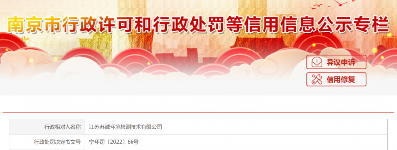 据南京生态环境局官网通报,近日,江苏苏诚环境检测技术有限公司因选择性记录原始数据被责令立即改正违法行为,罚人民币16万元,并没收其违法所得765.35元。